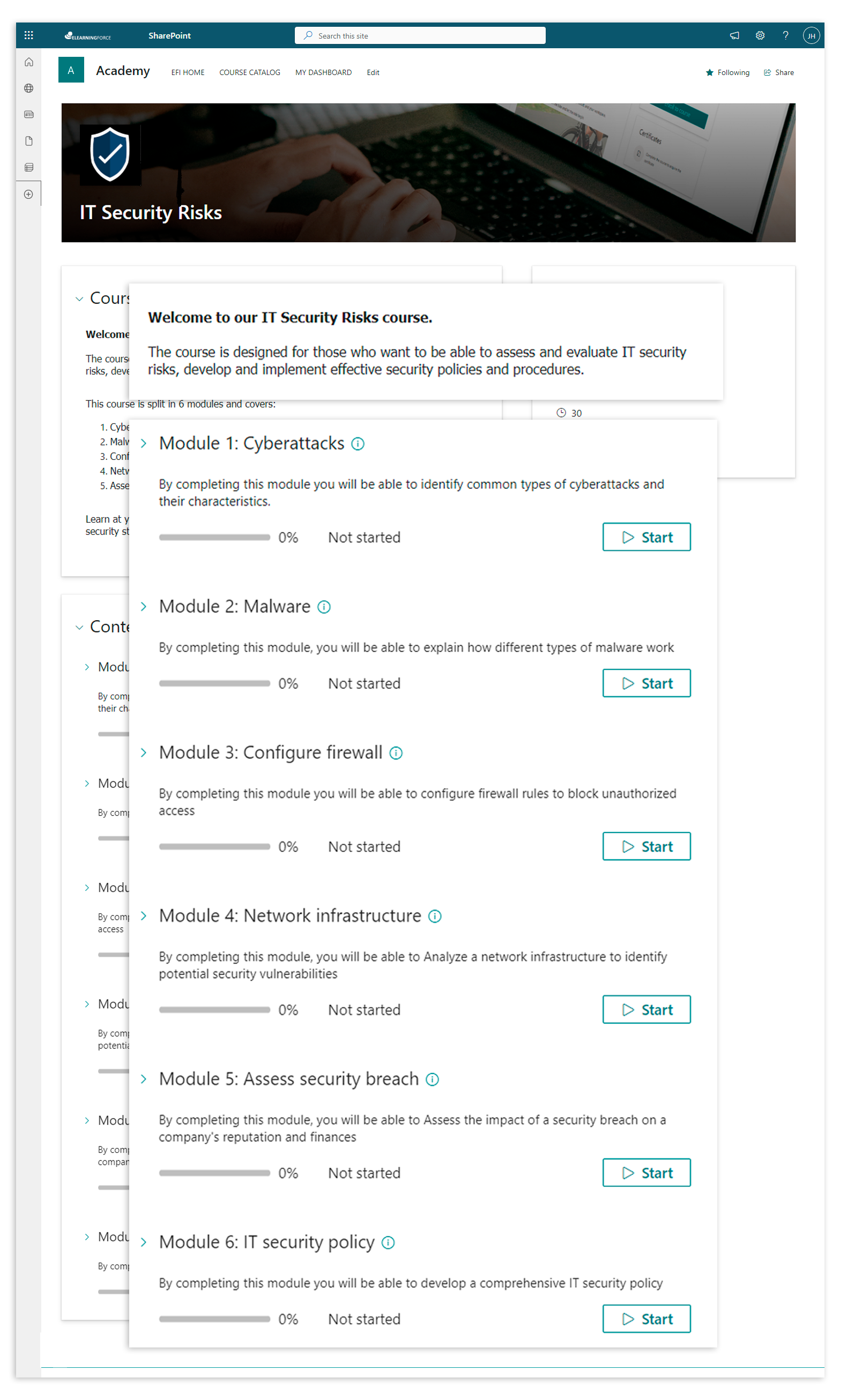 In the following example, we have included the learning goal in the course description and the learning objectives are included in the descriptions of the 6 learning modules that make up the course. Each of the 6 learning objectives is aligned with the steps in Bloom's Taxonomy framework.